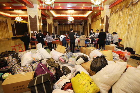 当天,17位大学生志愿者经由该中心负责人雷潘懿同学安排,早早来到炉峰禅寺,共同参与御寒衣物的整理工作。在了德常务副会长和工作人员的指导下,学生们将百余袋(箱)旧衣物从慈联会办公室搬至大斋堂,并在提前准备好的置物台上开始了一天紧张而有序的整理工作。