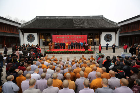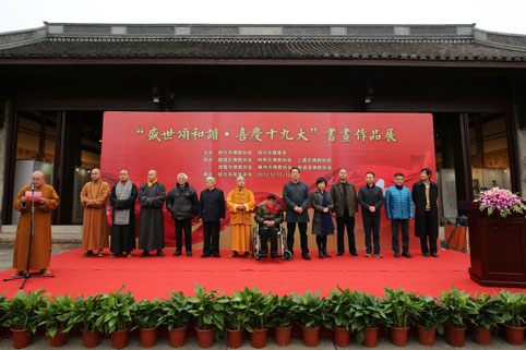 12月13日(农历十月廿六),为庆祝党的十九大胜利召开,展示绍兴市佛教界、书画界人士的爱国情怀和艺术风范,由绍兴市佛教协会、绍兴市墨趣会联合越城区佛教协会、柯桥区佛教协会、上虞区佛教协会、诸暨市佛教协会、嵊州市佛教协会、新昌县佛教协会共同举办的“盛世颂和谐•喜庆十九大”书画作品展在王羲之故宅——戒珠讲寺灵山宝殿隆重开幕。