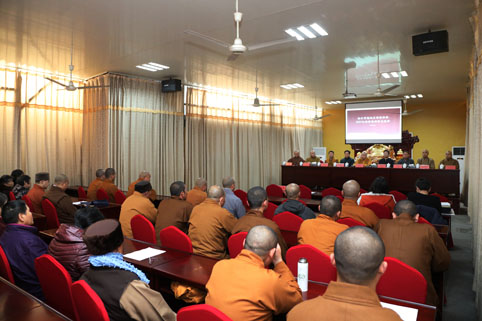 越城区民宗局王永兴局长、市佛协净芳会长、区佛协了成会长分别致辞,越城区佛协副会长本印法师主持会议,越城区寺庵僧信代表随缘参加。